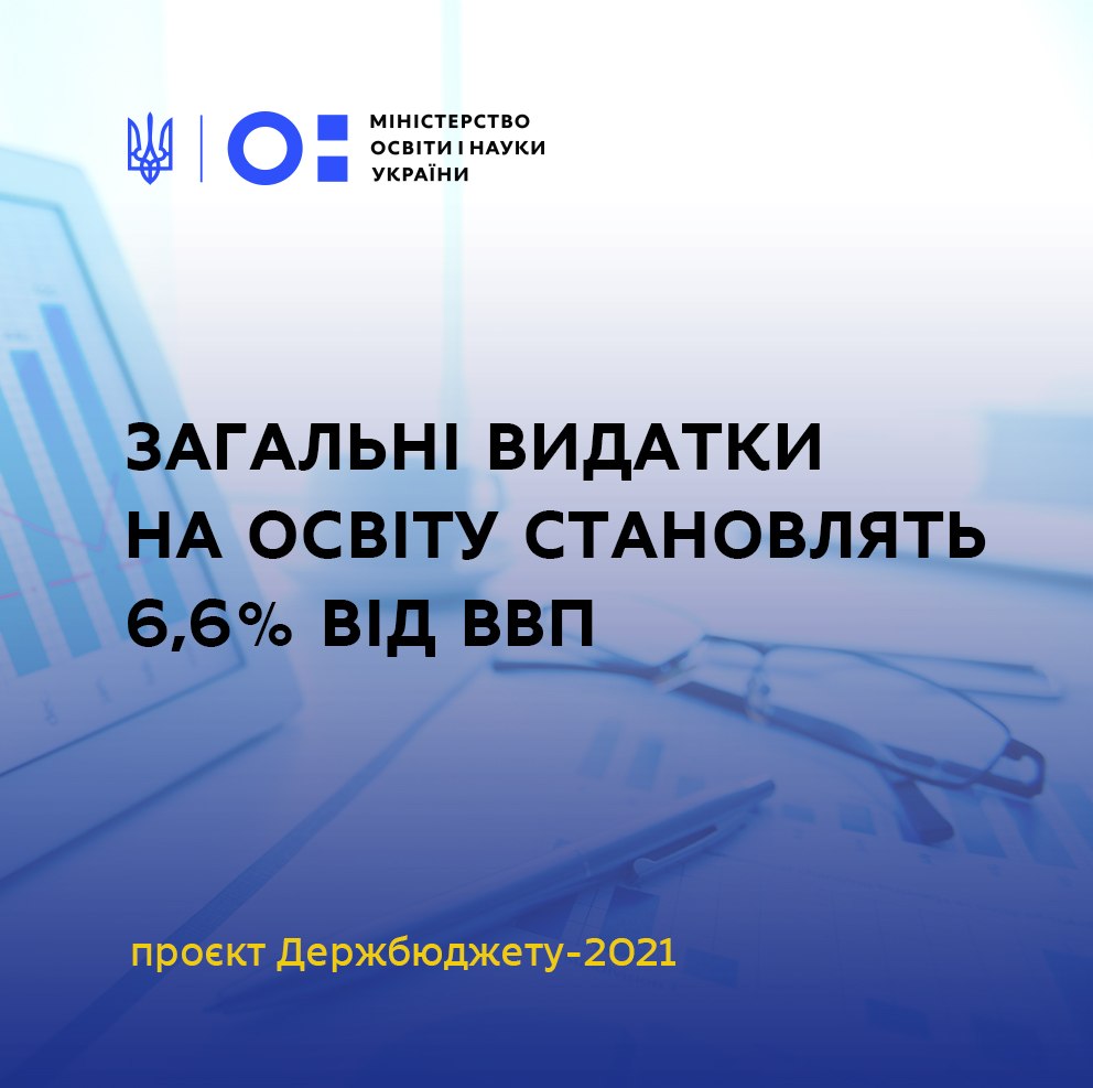 Згідно з проєктом Держбюджету-2021 загальні видатки на освіту становлять 6,6% від внутрішнього валового продукту. Про це повідомив очільник Міністерства освіти і науки України Сергій Шкарлет у своєму Telegram-каналі.