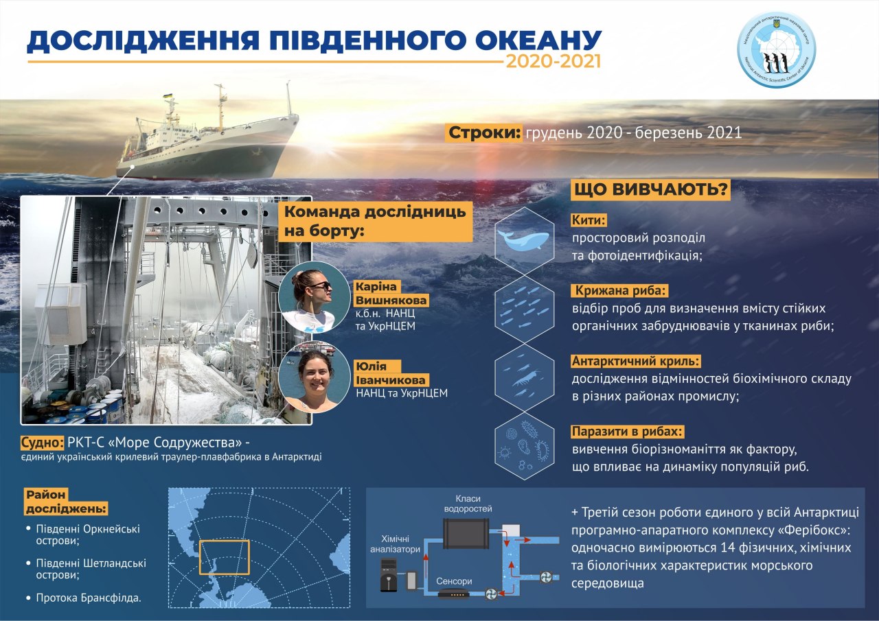 Сьогодні, 8 грудня 2020 року, почалася експедиція українських науковиць, які близько трьох місяців досліджуватимуть Південний океан. З порту Кейптауна (Південно-Африканська Республіка) до берегів Антарктиди вирушили Каріна Вишнякова та Юлія Іванчикова, які представляють Національний антарктичний науковий центр та Український науково-дослідницький центр екології моря. Вчені працюватимуть на українському траулері «Море Содружества», що вестиме промисел антарктичного крилю.