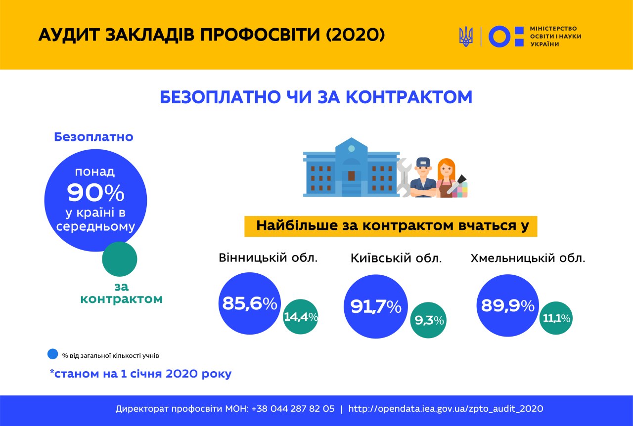 Більшість учнів профтехів навчається на бюджеті, а ще безкоштовно проживає в гуртожитках. Це підтверджують результати аудиту галузі. У середньому понад 90% випускників шкіл, які обрали профосвіту, навчаються за регіональним або державним замовленням, а за контрактом вчаться здебільшого дорослі. Найбільше контрактників у Вінницькій (14,4%), Хмельницькій (11,1%) та Київській (9,3%) областях.