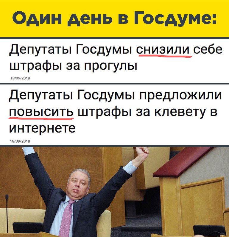 А если всякие «бузотёры» продолжат писать в интернете, что депутаты вконец обнаглели, то для них слуги народа предусмотрительно решили поднять штрафы за так называемую «клевету в интернете».