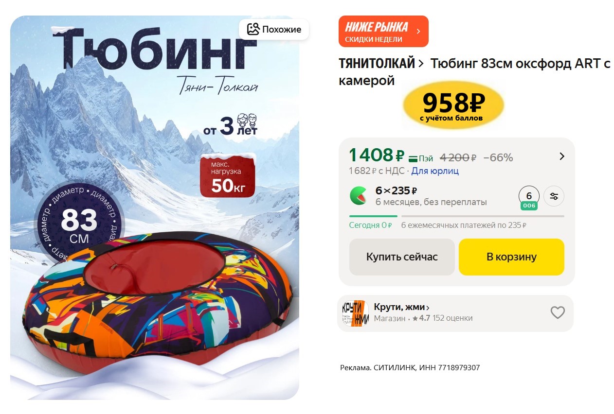 • Тюбинг ART за 1408₽ + 450 баллов за отзыв. Диаметр 85 см, материал Oxford 600D, есть ручки и буксировочный трос. Усиленная камера в комплекте. По такой же цене принт SUPERKITTY.
