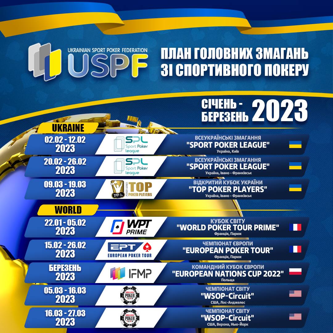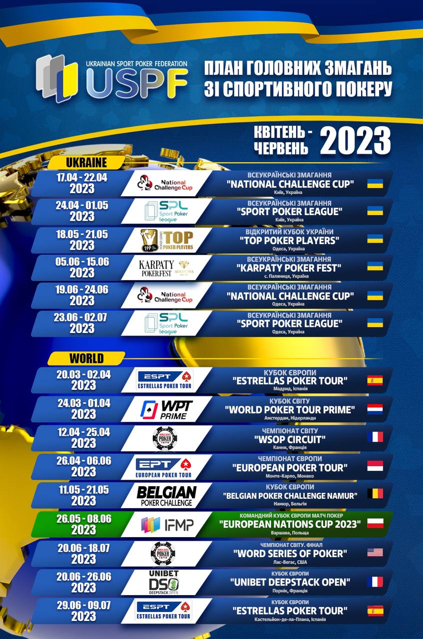 🗓 До вашої уваги розклад змагань зі спортивного покеру на квітень-червень 2023 року