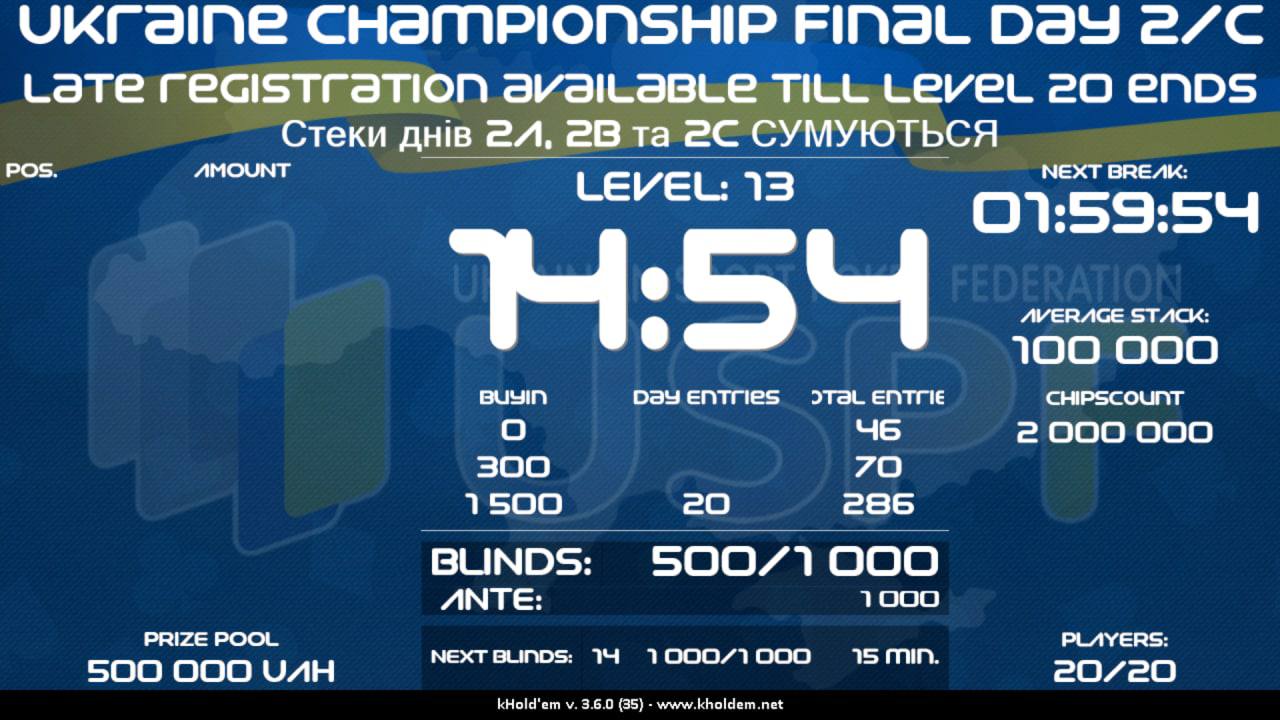 👉 53/98 гравців продовжують змагатися далі у Чемпіонаті України. Гра триватиме ще 4 рівні або поки не залишиться 20% учасників із загальної кількості входів (середній стек 500 000)