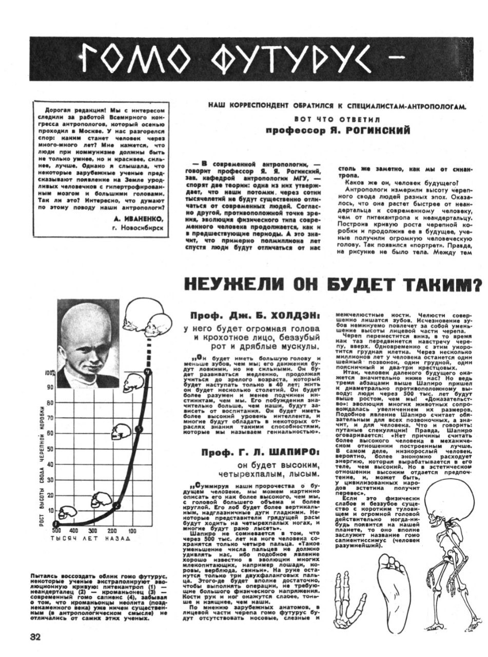 Будет ли человек будущего похож на головастика - этот вопрос, оказывается, очень сильно волновал читателей журнала Техника молодежи в 1965 году, и узнал я об этом из статьи, скан которой любезно подогнал Денис Сивков, автор Земляков и землян. За год до публикации статьи в Москве прошел Международный конгресс этнографических и антропологических наук, и широкий светский читатель узнал, как зарубежные физантропологи представляют себе человека будущего, экстраполируя тренды эволюции Homo Sapiens.