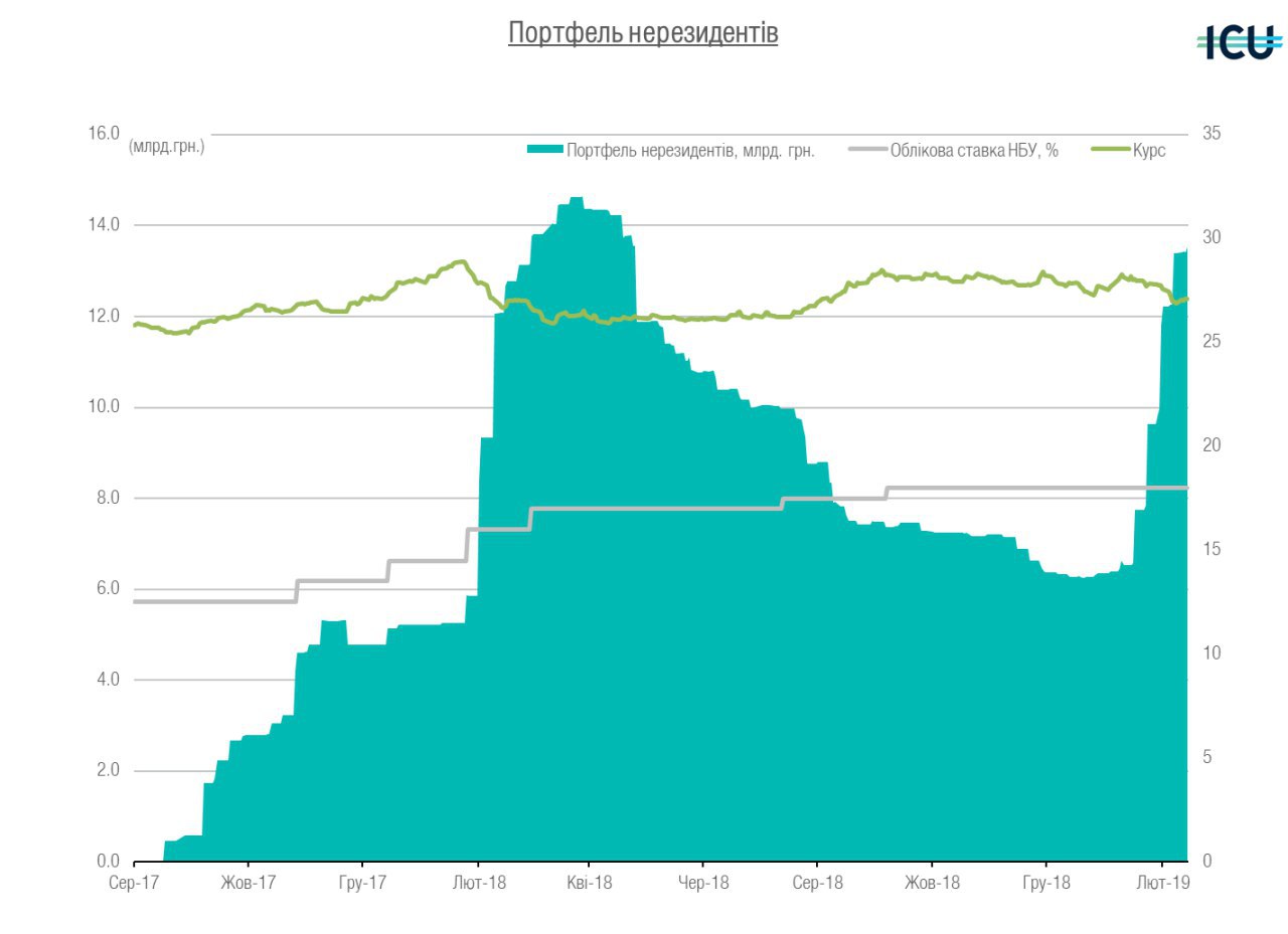 Досить цікаву інформацію наводить одна з українських бірж - ПФТС - щодо тих угод, які укладались на цій біржі. "Кожна третя угода з державними облігаціями, укладена в 2018 році на ПФТС, відбувалась за участю іноземних інвесторів." Вони "уклали з ОВДП біржових контрактів на загальну суму 33 млрд. грн.". Тобто з усього обсягу угод з ОВДП - поняд 13% обсягу дали нерезиденти. Це при тому що у загальному обсязі ОВДП в обігу - їхня частка лише 1-2%.