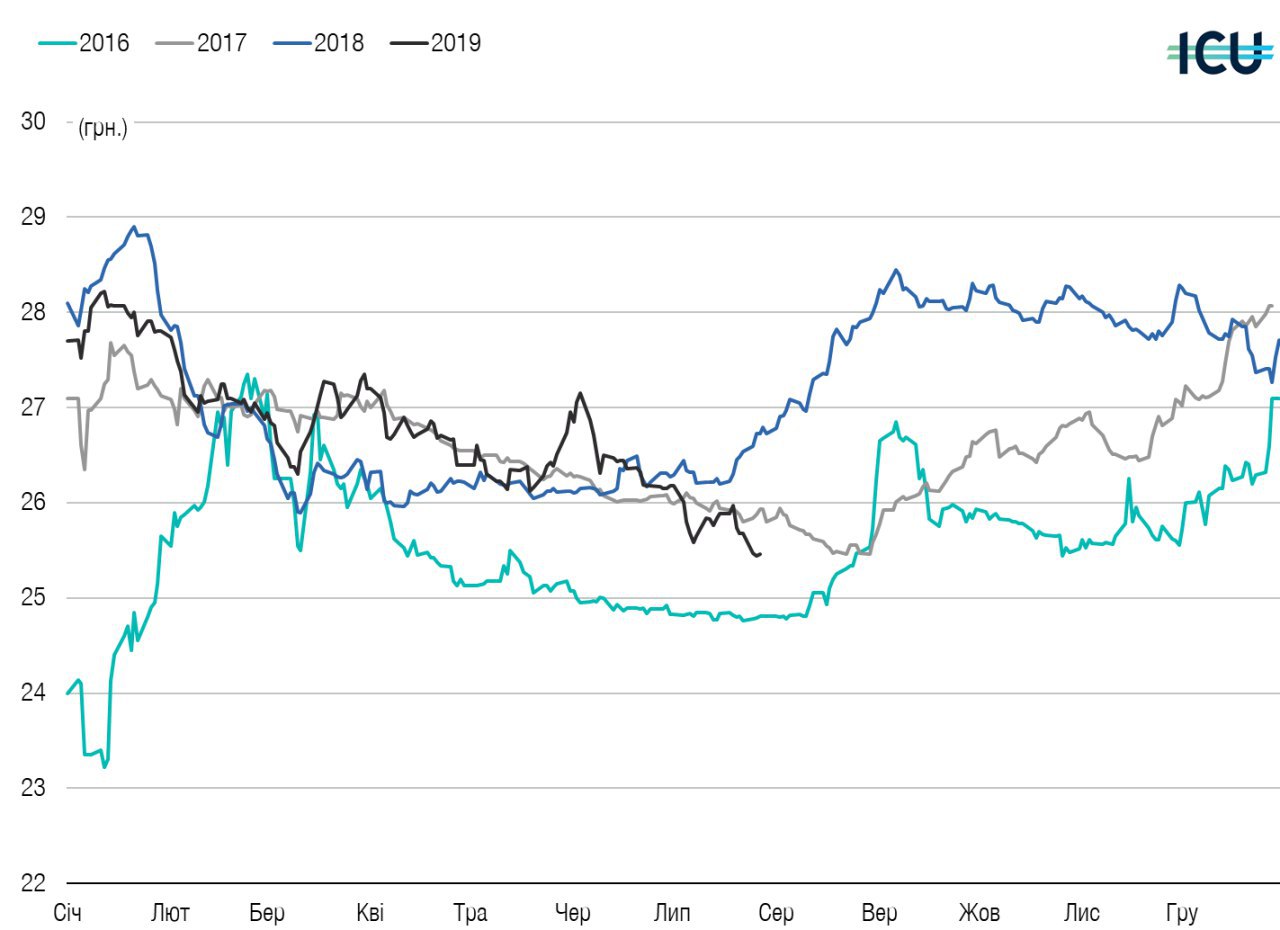 - перша декада серпня може зіткнутись з дещо більшим попитом і меншою пропозицією, що і спричинить відкат до 26 грн/$.