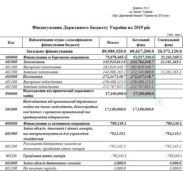 1. Бюджетом 2019 року передбачено по загальному фонду бюджету ₴324,8 млрд позик, ₴272,3 млрд погашень. Надходження від приватизації - ₴17.1 млрд. Чисте фінансування - ₴52,5 млрд грн. Спецфонд не чипаємо, бо це, вочевидь, програмні позики на конкретні витрати.
