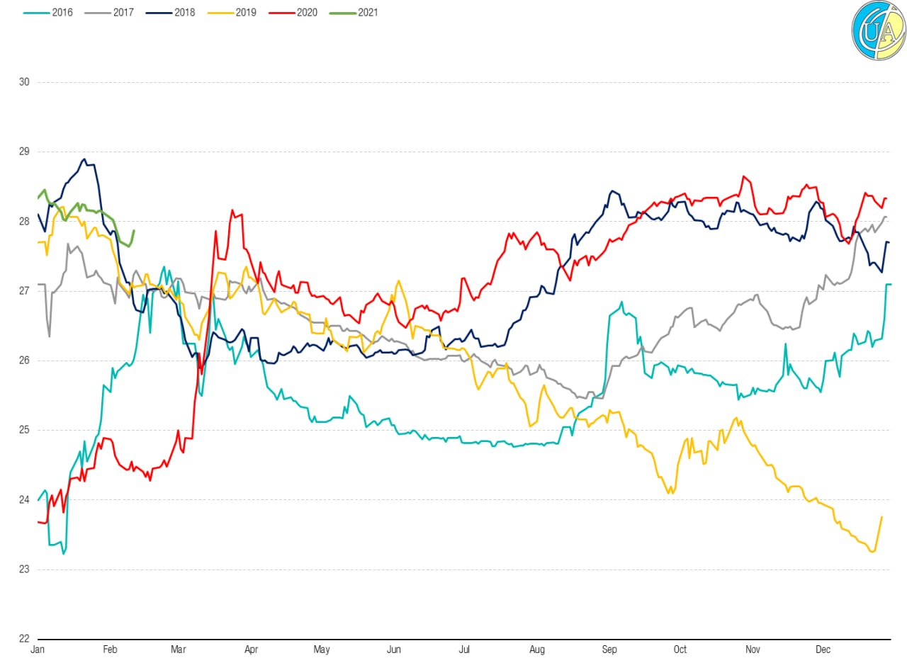 Але переважно щороку під кінець першої декади лютого відбувається корекція курсу після укріплення і це не на довго. Сезонність зберігається і нічого страшного зараз не відбувається. Скоріш навпаки - є шанс зловити локальний пік і перейти у гривню, для тих хто цього бажає.