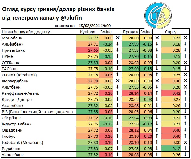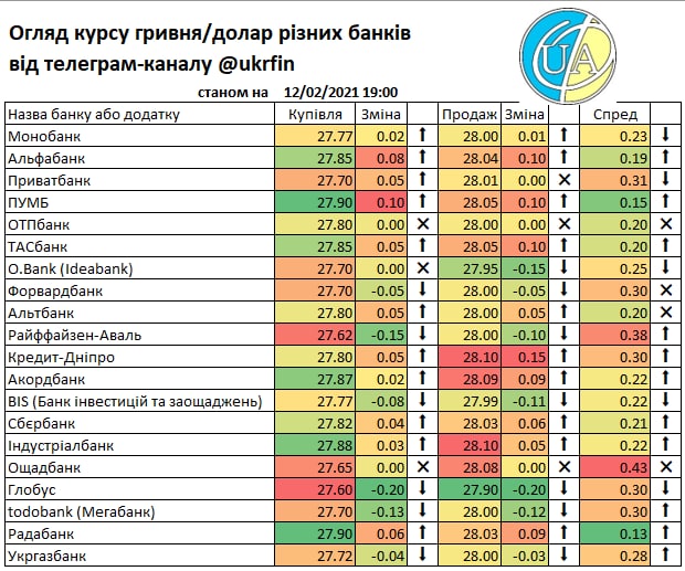 Ну і навздогін огляд роздрібних курсів станом на 18:30 сьогодні. Хоча ще далеко не всі переглянули свої роздрібні курси після торгової сесії. Адже наразі вже #курс просів до ₴28.13/$ до цього часу... тому до ранку може ще десь затримається, але ті банки що працюють з обміном онлайн можуть ще сьогодні все змінити.