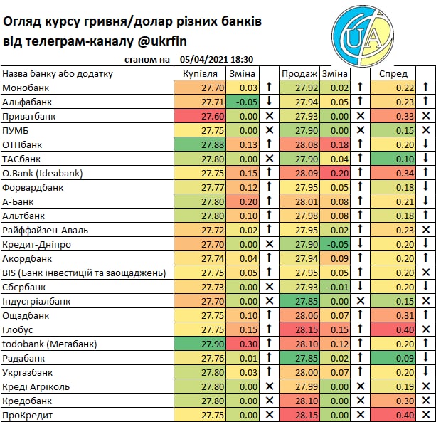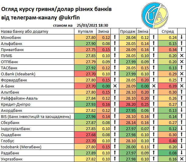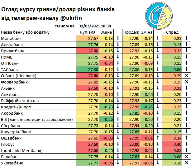 А такий рух міжбанку звісно що отримав відображення у курсах банків. Правда не всі ще зреагували (або цього не видно у додатках та на сайтах), але вже є ті що купують дешевше ніж по ₴27/$. Детальніше - у традиційній табличці.