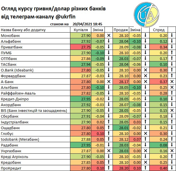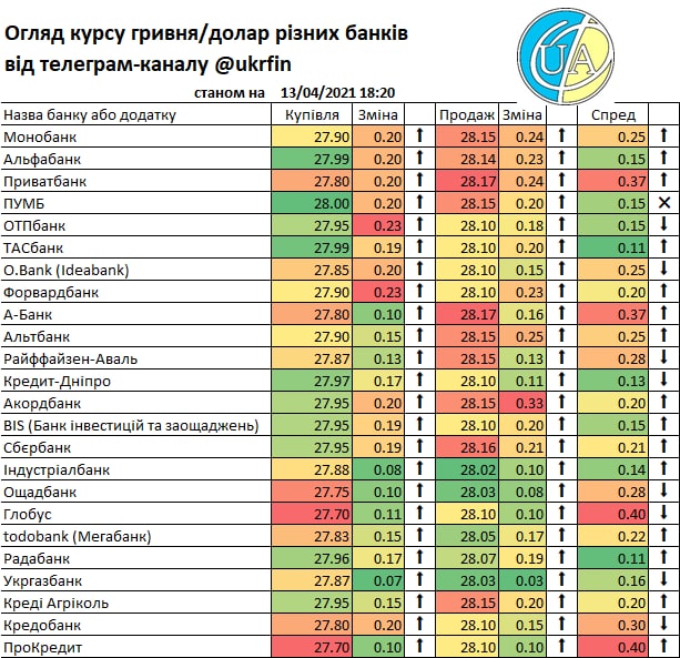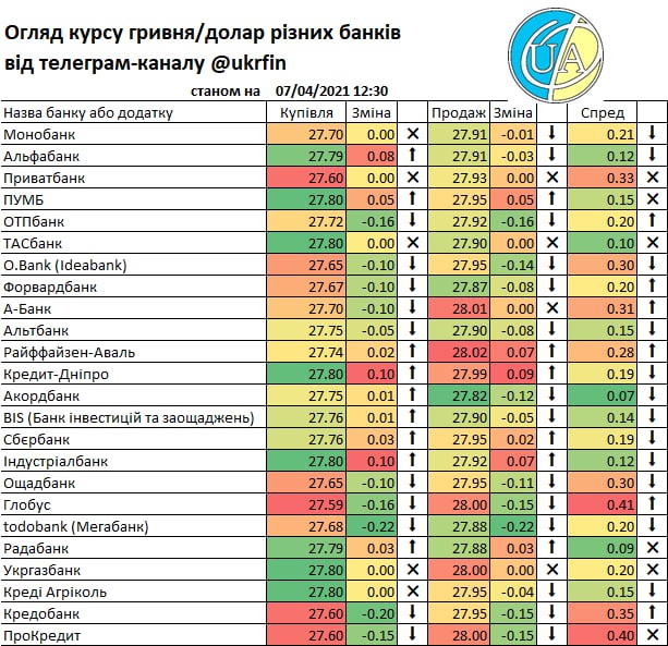 А такий рух міжбанку звісно що отримав відображення у курсах банків. Правда не всі ще зреагували (або цього не видно у додатках та на сайтах), але вже є ті що купують дешевше ніж по ₴27/$. Детальніше - у традиційній табличці.