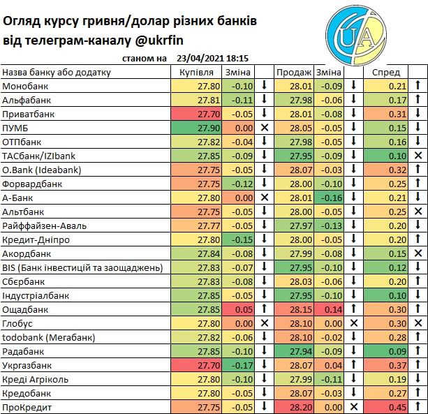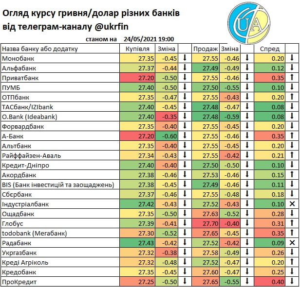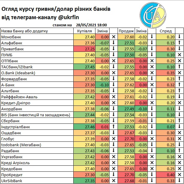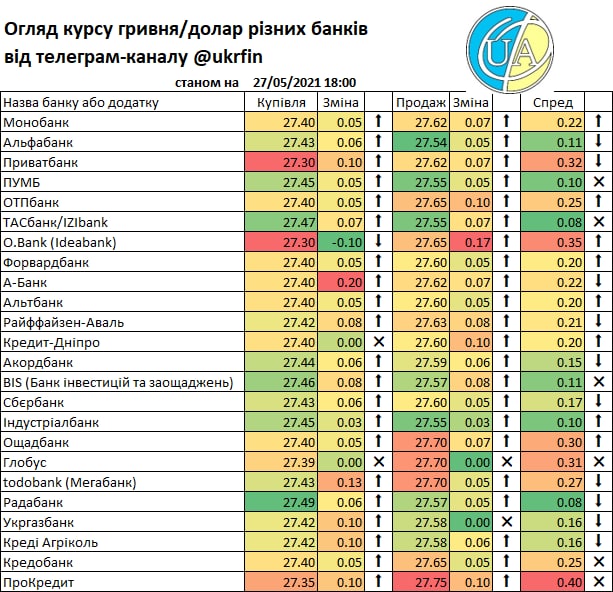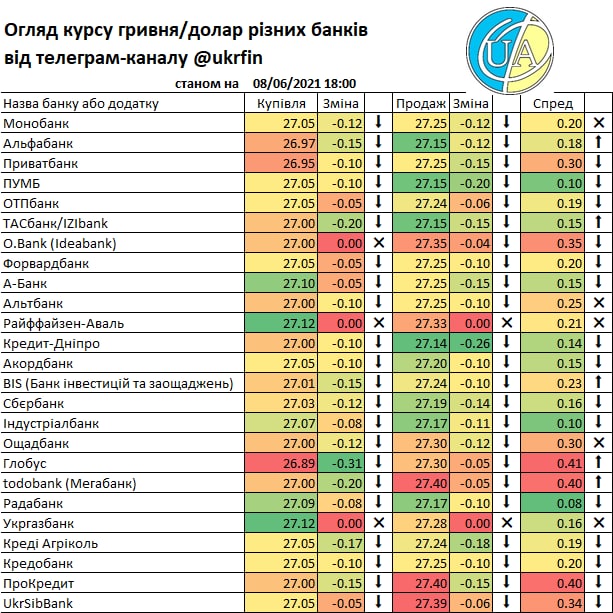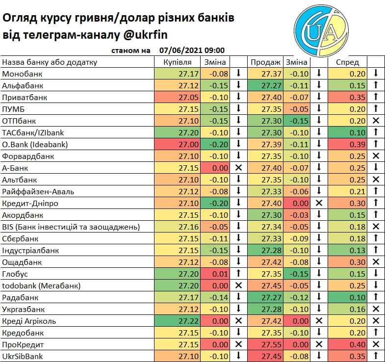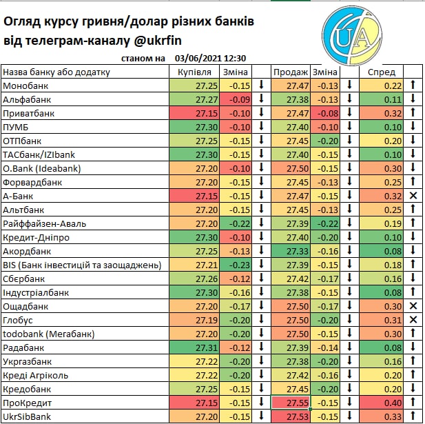 А такий рух міжбанку звісно що отримав відображення у курсах банків. Правда не всі ще зреагували (або цього не видно у додатках та на сайтах), але вже є ті що купують дешевше ніж по ₴27/$. Детальніше - у традиційній табличці.