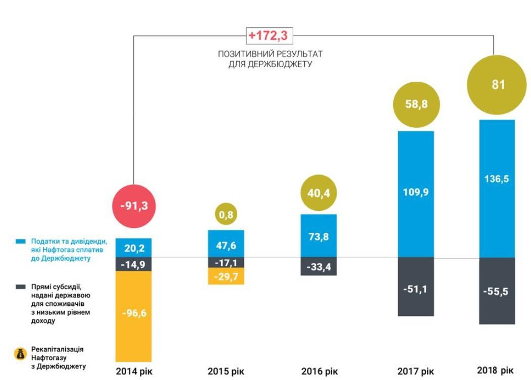 Нафтогаз та його підтриємства за минулий рік сплатили до бджету 136,5 млрд грн (в т.ч. дивіденди), які фактично забезпечили коштами 55,5 млрд грн субсидій та принесли бюджету додатково 81 млрд грн. Якщо порівняти 3 2014 роком - то тоді бюджет отримав 20.2 млрд грн, з них витратив 14.9 млрд грн, а ще 96,6 надав облігаціями щоб Нафтогаз зміг розрахуватися з боргами. (див. графік нижче).