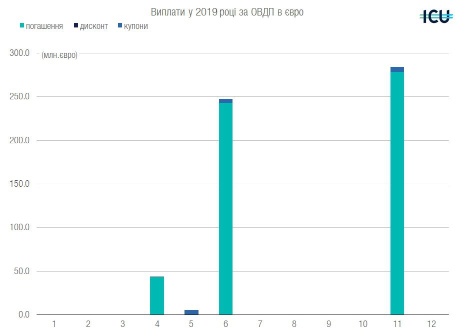 Як результат - переважна більшість боргових виплат всередині країни припадає на початок року. Зі 100 млрд грн 50 - у перщому кварталі. Але єдиною проблемою для міністерства фінансів може стати вартість рефінансуваня боргу, після піднятої до 20,5% ставки у грудні. Але всі виплати будуть своєчасними, адже 46% ОВДП у портфелі НБУ (а від нього хочуть перерахування прибутку за підсумками 2018 року) і ще 40% у портфелях держбанків, то невиплата за внутрішнім боргом може створити ще більше проблем для держави, ніж дорогий борг.