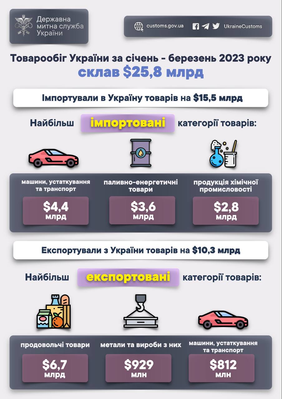 Протягом першого кварталу 2023 року в Україну імпортували товарів на суму $15,5 млрд, а експортували – на суму $10,3 млрд.