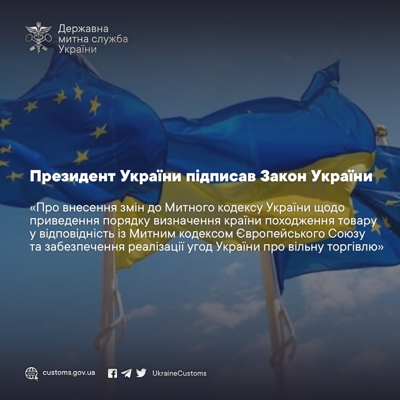 🖋Президент України підписав Закон України «Про внесення змін до Митного кодексу України щодо приведення порядку визначення країни походження товару у відповідність із Митним кодексом Європейського Союзу та забезпечення реалізації угод України про вільну торгівлю»