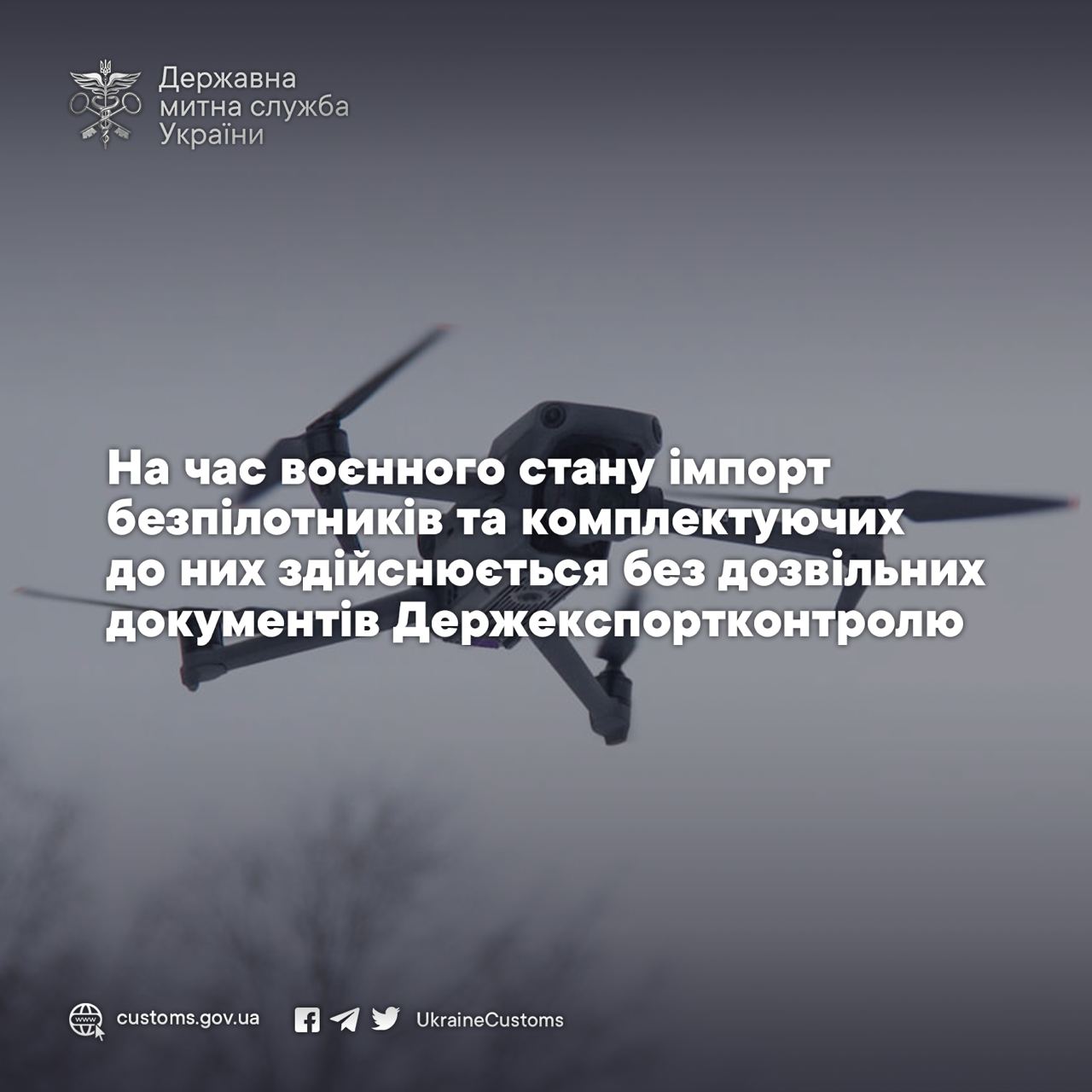 🪖На час воєнного стану імпорт безпілотників та комплектуючих до них здійснюється без дозвільних документів