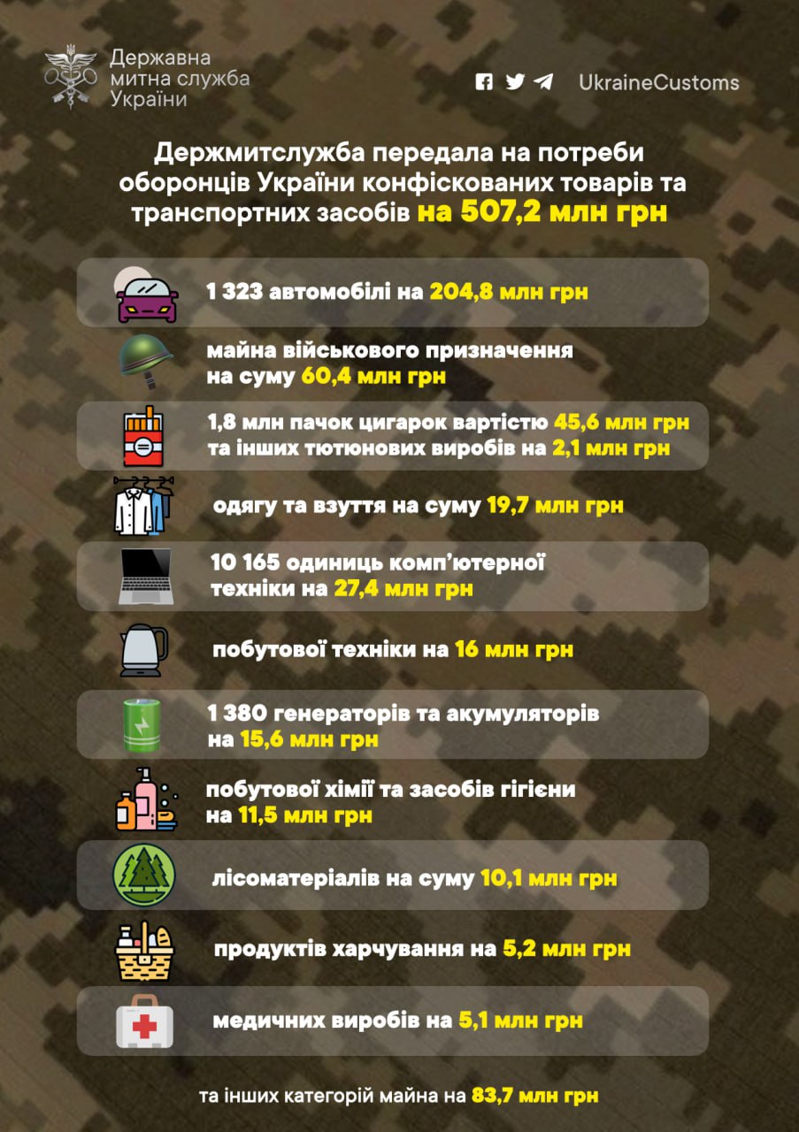З 24 лютого 2022 року Сили Оборони України отримали зі складів митниць конфісковані товари і транспортні засоби на 507,2 млн грн. Зокрема, одному бойовому підрозділу був переданий літак.