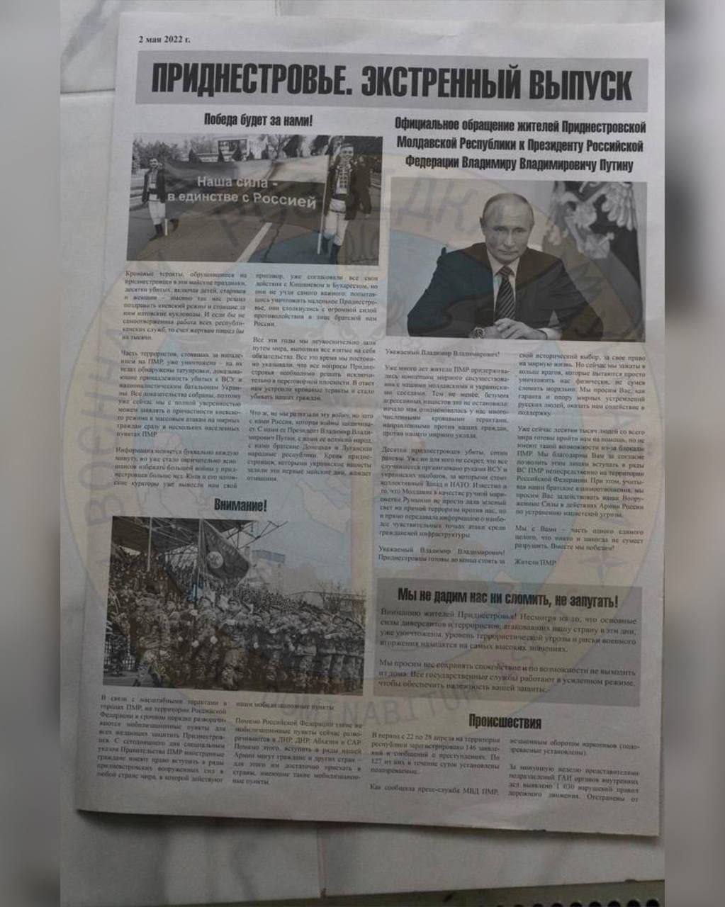 ▪️У Придністров'ї вже надрукували великий наклад газети, датований 2 травня 2022 року, у якому жителі нібито звертаються до путіна з проханням "залучити збройні сили "ПМР" в діях армії рф". Газета містить низку матеріалів про "криваві теракти, які звалились на придністровців на травневі свята, десятки вбитих, включаючи дітей, старих та жінок".