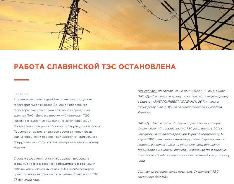 ▪️ Слов'янську ТЕС у Донецькій області зупинили, – «Донбасенерго». Район, де розташована ТЕС, останніми днями – під постійними обстрілами. Тому «з метою збереження життя та здоров'я персоналу» роботу станції вирішили зупинити. Це зробили вчора, 27 травня 2022 року.
