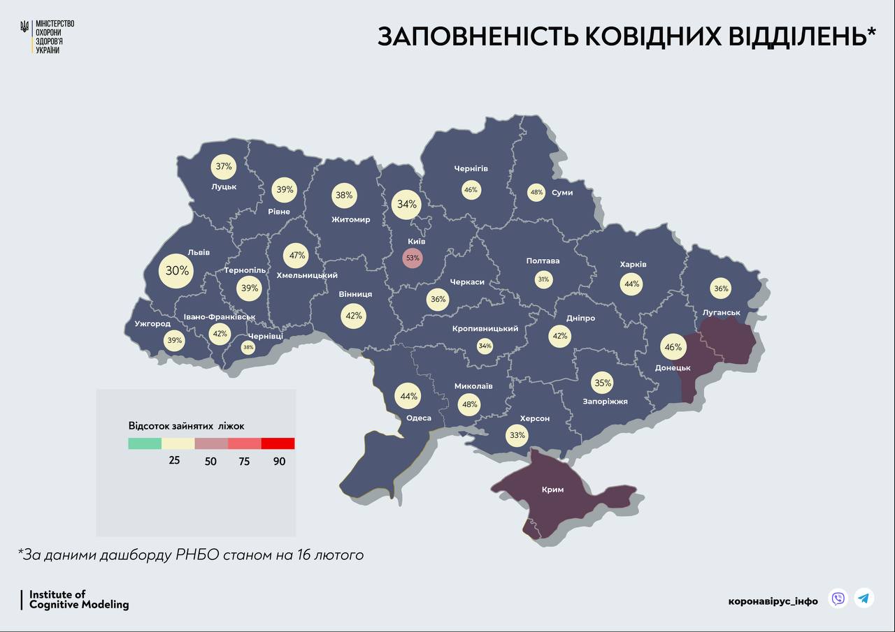 Київська область лідирує за заповненістю ковідних відділень — 53,5% (1 211 осіб). Також високий рівень госпіталізацій зафіксовано в Сумській, Рівненській, Миколаївській та Хмельницькій областях.