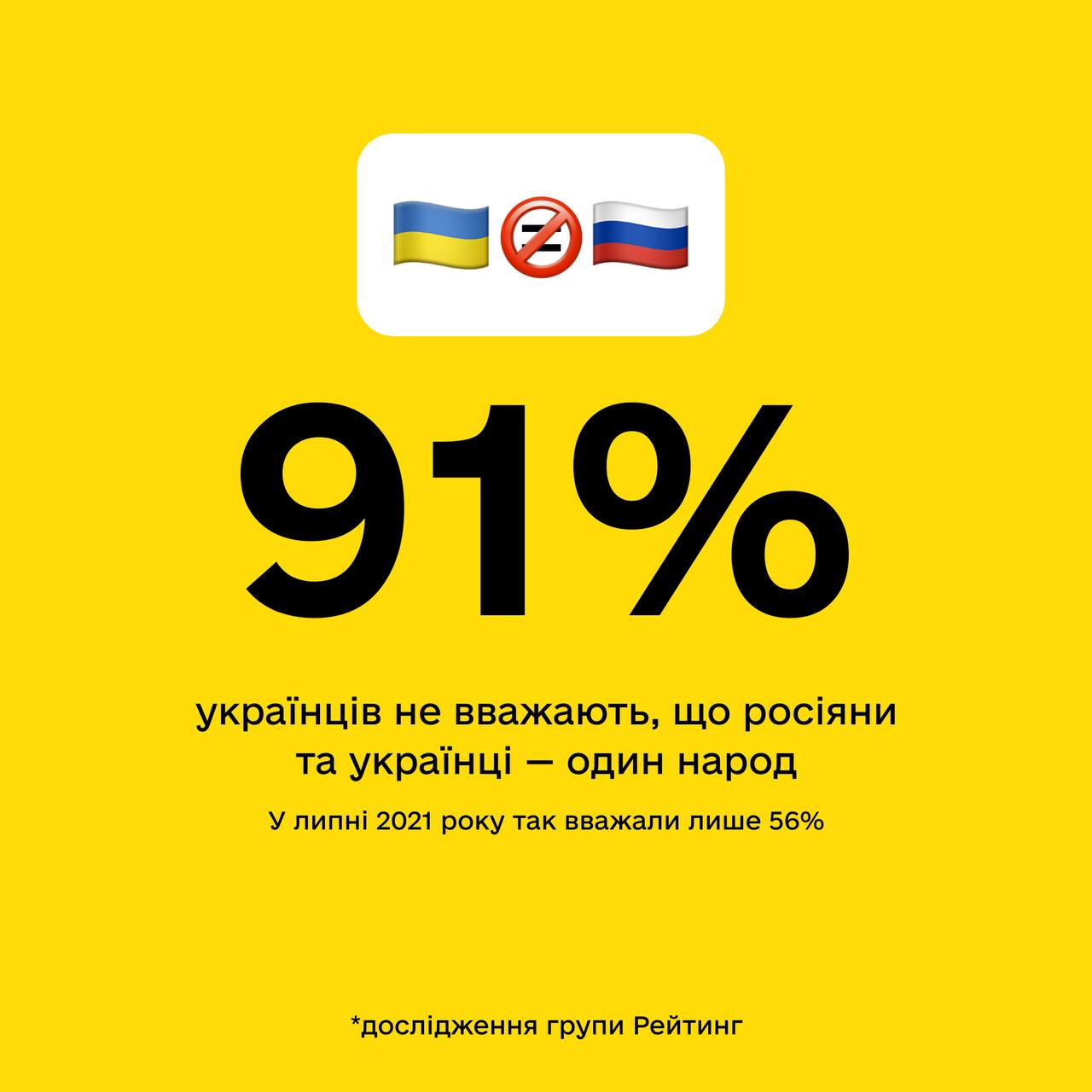 ⚡️91% українців не вважають, що росіяни та українці — один народ. У липні 2021 року так вважали лише 56%, - дослідження групи Рейтинг