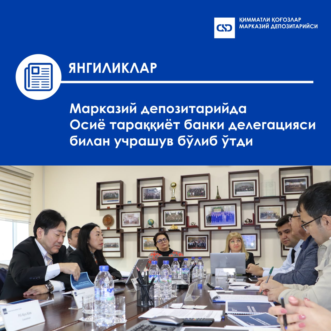 Жорий йилнинг 17 ноябрь куни Қимматли қоғозлар Марказий депозитарийсида Осиё тараққиёт банки (ОТБ) делегацияси аъзолари билан учрашув бўлиб ўтди. Учрашув давомида делегация аъзоларига Ўзбекистон депозитарлик тизими ва Марказий депозитарий фаолиятини ривожлантириш доирасида амалга оширилаётган лойиҳалар тўғрисида маълумотлар тақдим этилди. Шу муносабат билан томонлар корпоратив ва давлат қимматли қоғозлари ҳисобини марказлаштириш, чет эл номинал сақловчилар учун ҳисобварақлар очиш ва бошқа лойиҳалар бўйича амалий масалаларни муҳокама қилдилар.