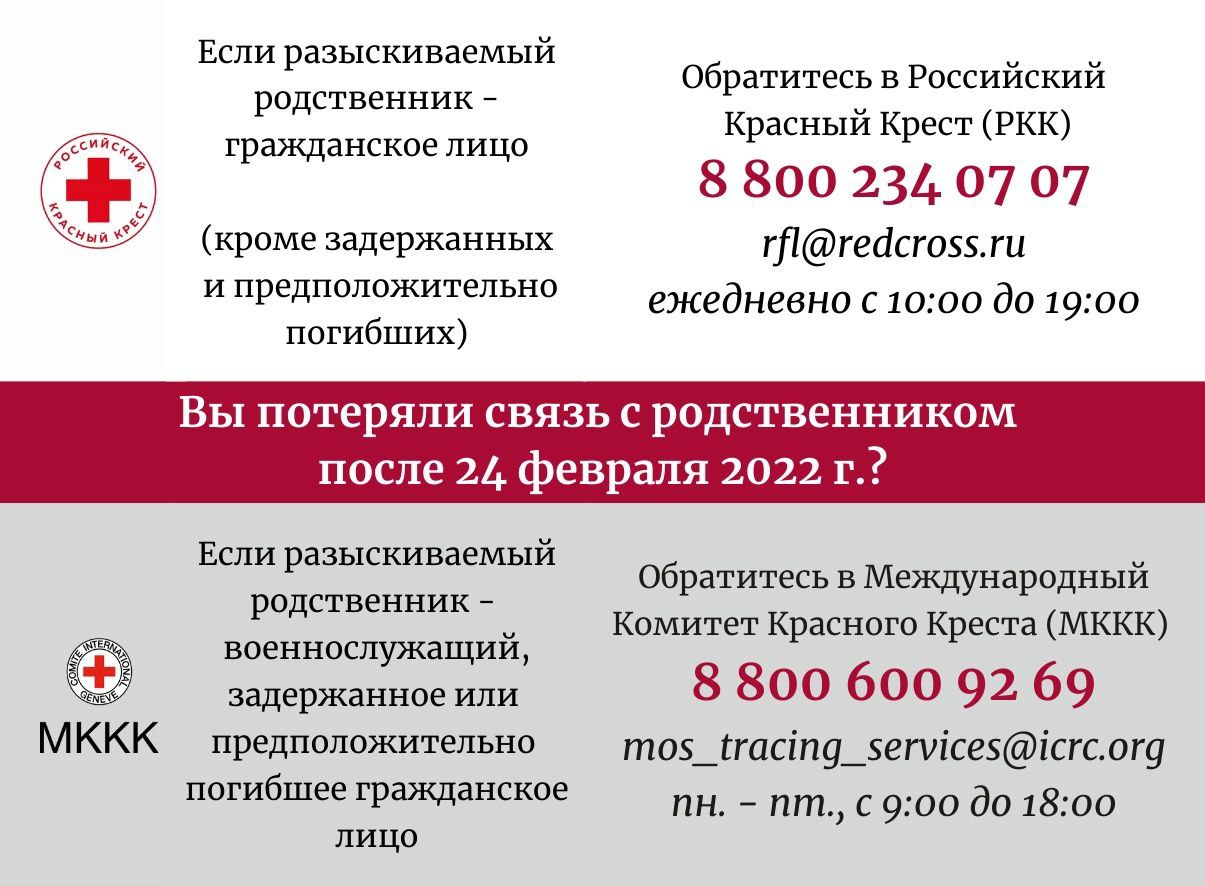 МККК открыл горячие линии, где организация получает запросы на любого пропавшего без вести человека от его родных. Организация сообщает, что на текущий момент открыто 13 тысяч запросов о поиске — и россиян, и граждан Украины.