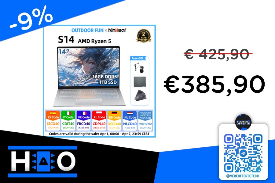 π portatile ninkear s14 da 14" con Ryzen 5 7535HS, 16GB di RAM e 1TB di SSD! Schermo IPS 2.2K e peso di solo 1kg, un vero ultrabook!