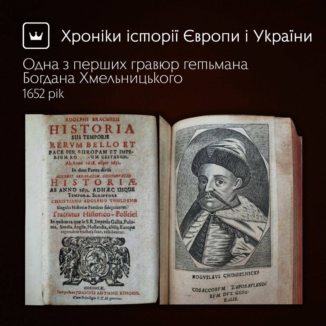 854-сторінковий стародрук містить 53 гравюрні зображення тогочасних лідерів Європи XVII, зокрема – Богдана Хмельницького. Ми звикли до портрета гетьмана на п'яти гривнях, відтвореного з гравюри фламандця Вільгельма Гондіуса, але у цій книзі – більш рідкісна робота досі невідомого нам гравера з Італії.