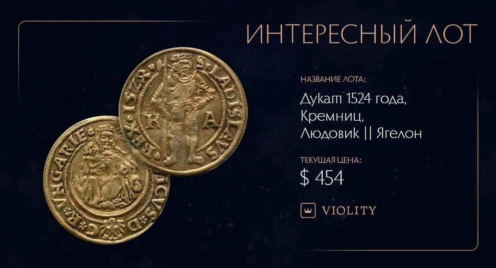 На Виолити продали редкую и интересную монету — Венгерский дукат того самого короля Людовика II Ягеллона (1516-1526) гг.