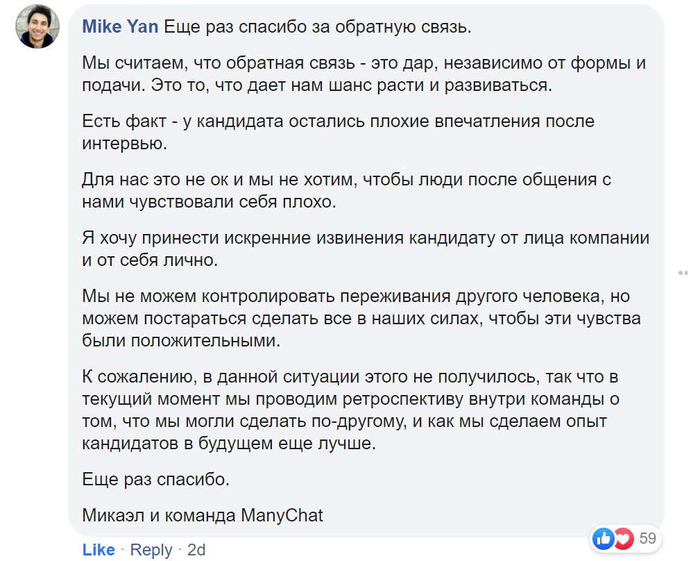 И нет, мы не защищаем ManyChat. Мы вообще ничего про них не знаем – может, у них на интервью и правда творится чОрт знает что. Но приложенный коммент основателя тем не менее рекомендуем сохранить как образец реакции на подобный трэш.