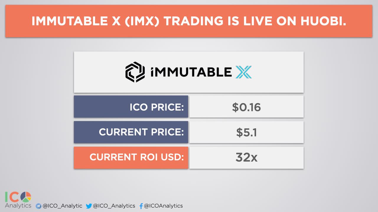 Immutable X (IMX) trading is live on Huobi. The token sale price on Huobi: $0.16 Current price: $5. Current ROI: 32x.
