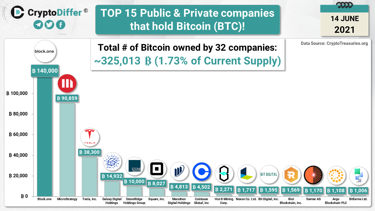 According to Crypto Treasuries, ~325,013 BTC are owned by 32 public and private companies. It's almost ~1.75% of the current circulation supply of Bitcoin & worth $12.7B USD. Top 3 companies that hold BTC are BlockOne, MicroStrategy & Tesla.