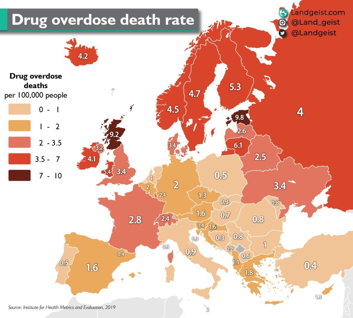 Цікава мапа. Наводиться смертність від наркотиків на 100 тис. населення.
