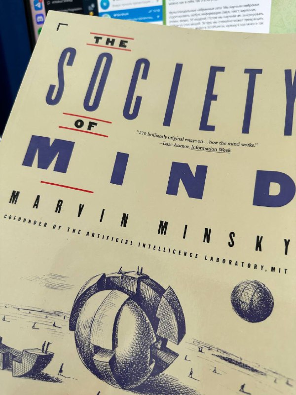 На фотографии — книга, которая лежит у меня на столе уже почти месяц. В ней (1986 год) рассказывается, что разум — это не единый инструмент, а постоянный диалог (социум) большого количества агентов, таких как память, слова, эмоции, логика. Автор — основатель MIT AI Lab.