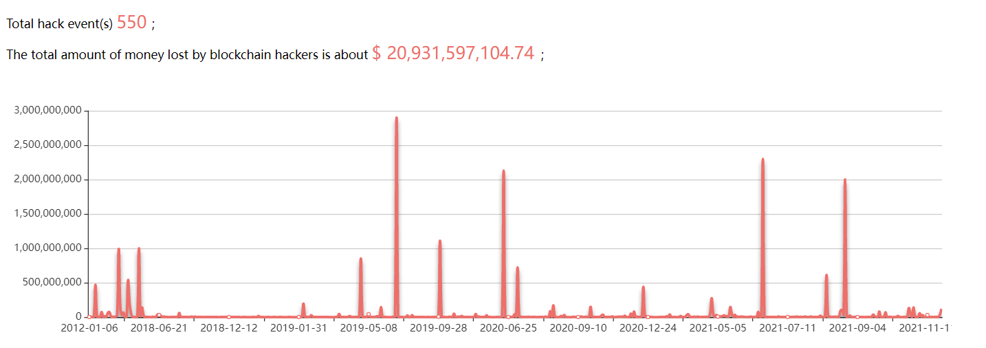 За всё время наблюдения (с 2012 года), ущерб от взломов и ошибок составил около $21 млрд. Примерно 15% пришлось на сеть эфира. Около 30% — на взлом бирж. SlowMist выделил, что больше всего потерь произошло по причине скама, далее идут несколько видов атак на DeFi.