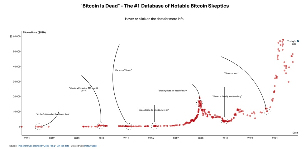 Каждая точка на графике — статья в СМИ или высказывание знаменитости, подразумевающее смерть биткоина. Можно считать это очередным индикатором хайпа. До напряженности 2017 года ещё очень далеко. Плотность похорон биткоина гораздо ниже, чем была несколько лет назад.