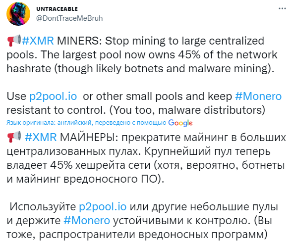 Сообщество призывает майнеров XMR, распространяющих вредоностное ПО, переключится на другие пулы для повышения децентрализации. Всё дело в сформировавшемся пуле, занявшим 45% хэшрейта сети.