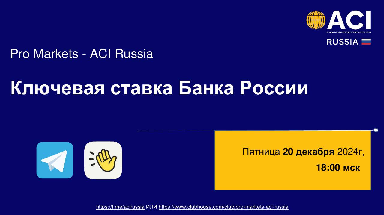 🔑 Сегодня в 1️⃣8️⃣:0️⃣0️⃣ в эфире Pro Markets - ACI Russia обсудим заключительное в этом году решение Банка России по ключевой процентной ставке.