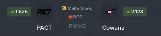 💡BO3 матч на турнире Malta Vibes, а это значит, что случайных исходов и отлетов быть не может. Победит тот, кто лучше подготовиться. Игроки обеих команд имеют опыт официальных игр и соответственно опыт индивидуальный. Если судить по последним матчам, то немцы из cowana совсем не сыграны и только и делают, что проигрывают всем составам. Я думаю, что для PACT не будет проблемой данный матч