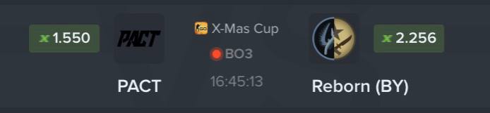 💡X-Mas cup. Выцепил для вас приятный коэфчик на каком-то рофлотурике. Команду Пакт вы и так сами знаете, да и в целом тут анализировать особо нечего. Эти ребята должны на спокойничах забрать эту встречу. Надеемся на уверенность Пакт в этом матче