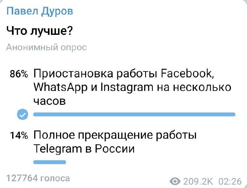 Зато все активно троллят Facebook и Марка Цукерберга, как всегда, в твиттере и телеграме. Вот и Дуров опрос новый запилил :)