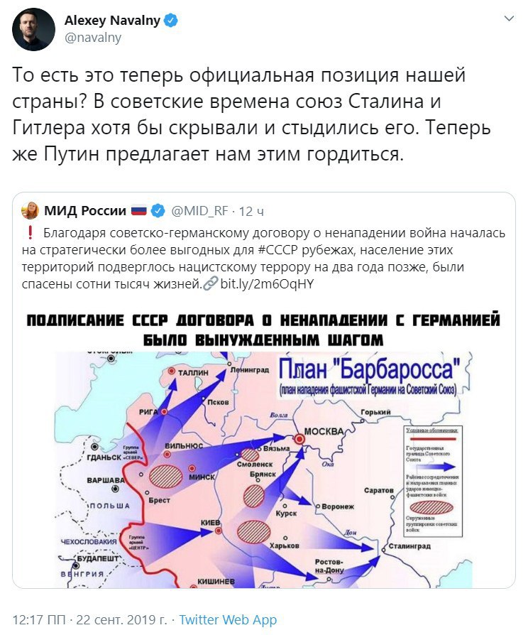 P.S. Заметка Навального, как минимум, не грамотна. В советское время пакта Молотова-Риббентропа не стыдились, а поддерживали примерно в тех же формулировках, что и нынешний МИД РФ.