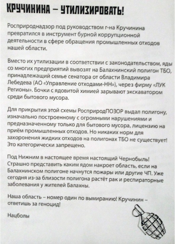😎 На здании межрегионального управления Федеральной службы по надзору в сфере природопользования по Нижегородской области и республике Мордовия появилась надпись «Кручинин – ответь за геноцид». Рядом неизвестные раскидали листовки с пояснениями: руководитель местного департамента РПН Олег Кручинин вместе с фирмой «ЛУК Регионы», принадлежащей семье сенатора Владимира Лебедева, уничтожает население области. Вместо утилизации токсичных жидких отходов со всей области компания сливает их на многострадальный Балахнинский полигон - который тоже находится в руках Лебедева - откуда яд попадает в Волгу.