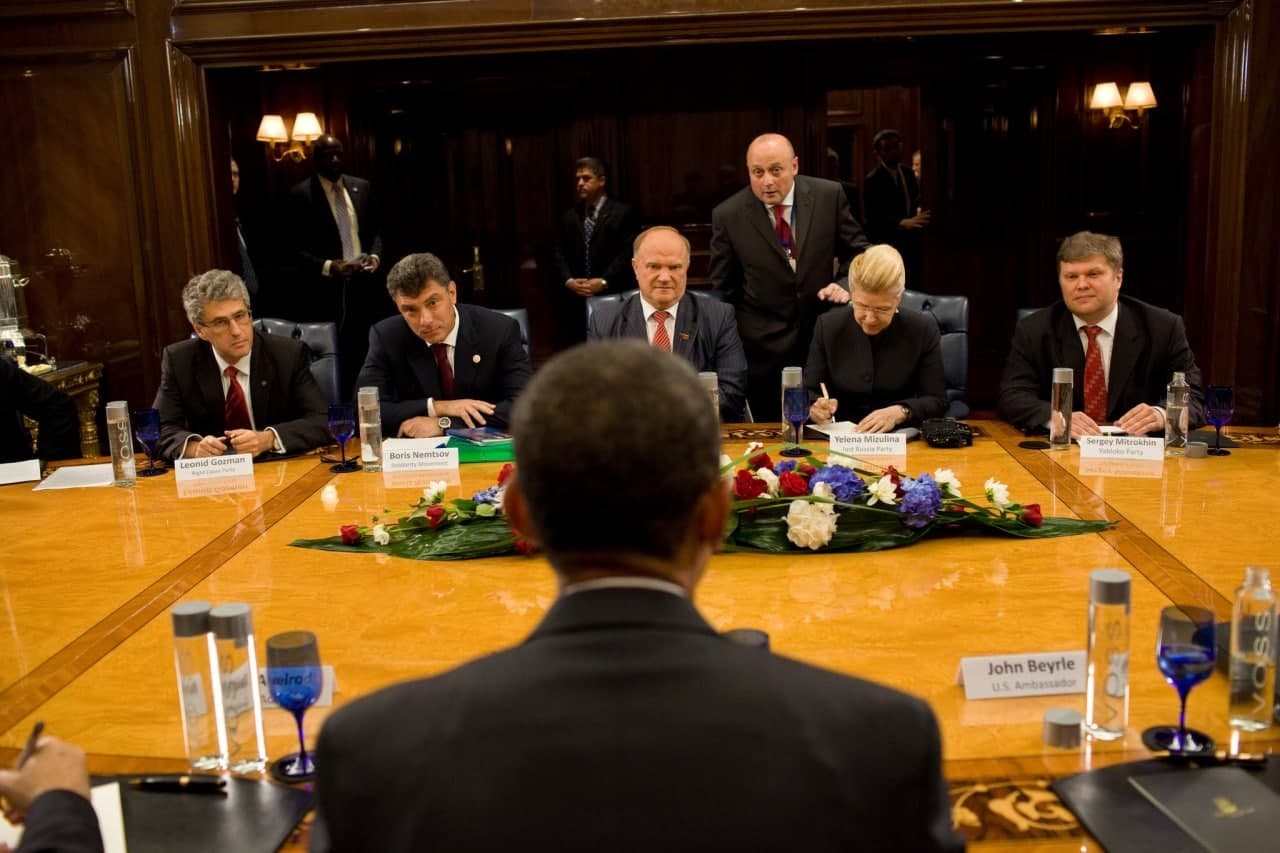 Бывший посол США в России Майкл Макфол выложил фотографию 2009 года: президент США Барак Обама (спиной) встречается с Леонидом Гозманом, Борисом Немцовым, Геннадием Зюгановым, Еленой Мизулиной, Сергеем Митрохиным. Шикарно уделал всех.