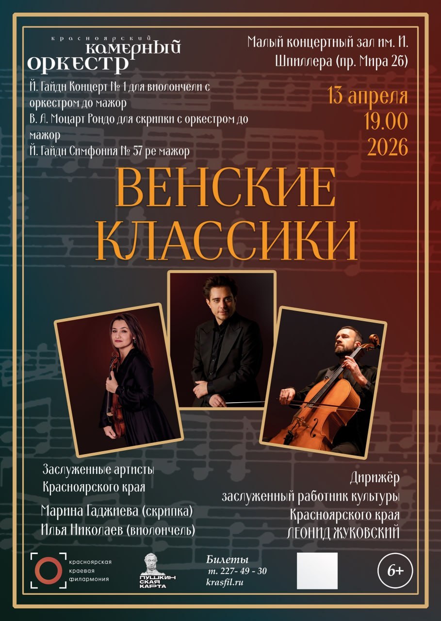 В программе Концерт № 1 для виолончели Гайдна, Рондо Моцарта для скрипки, Симфония № 57 Гайдна. Исполняют Красноярский камерный оркестр, дирижёр заслуженный работник культуры Леонид Жуковский и два заслуженных артиста края — Марина Гаджиева (скрипка) и Илья Николаев (виолончель).