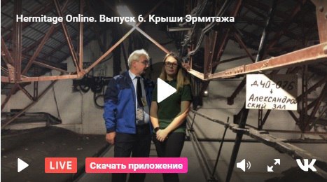 Государственный Эрмитаж в прямом эфире ведет экскурсию по чердакам и крышам Зимнего дворца. Сотрудники показывают конструкции, которые удерживают потолки парадных залов; рассказывают о технологиях, позволяющих поддержать температурно-влажностный режим и освещение в залах со световыми фонарями.
