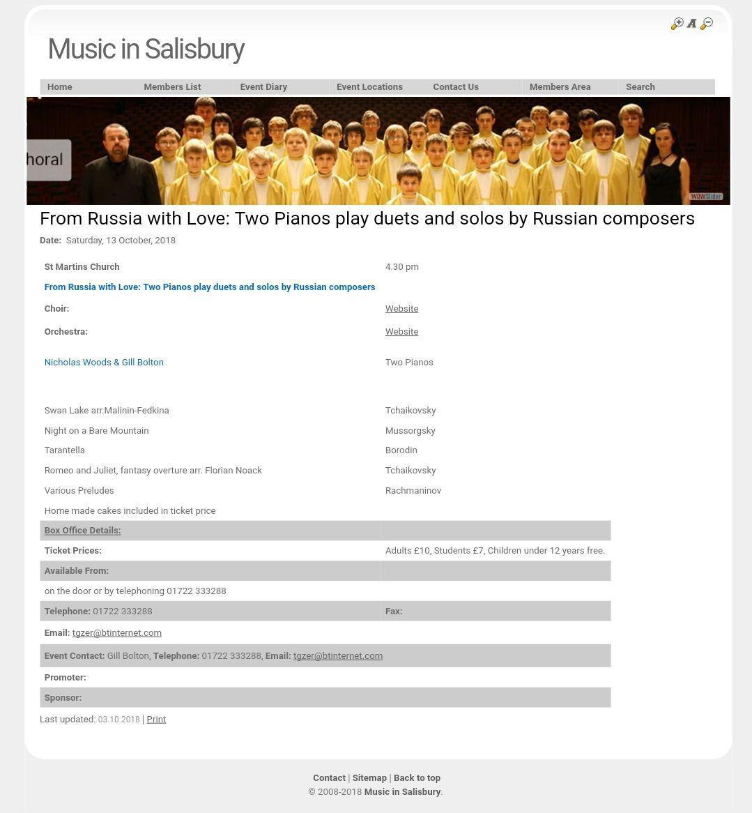 Как следует из официального анонса на сайте «Музыка в Солсбери», концерт, действительно, состоится. Субботним вечером исполнят «Лебединое озеро» и «Ромео и Джульетту» Чайковского, «Ночь на лысой горе» Мусоргского, «Тарантеллу» Бородина и прелюдии Рахманинова. В стоимость билета — от семи до десяти фунтов стерлингов — включена «домашняя выпечка», а играть будут на двух роялях https://calendar.fontanka.ru/articles/7187/