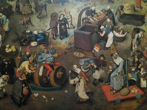 Это — картина «Битва Масленицы и поста» с выставки Питера Брейгеля Старшего в Вене. Во времена художника эта работа выглядела не совсем так, но в XVIII веке вмешалась цензура...